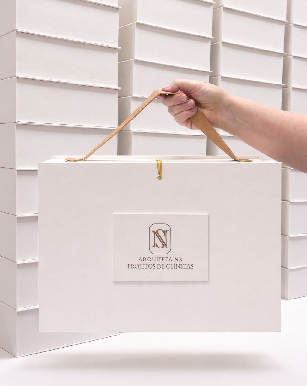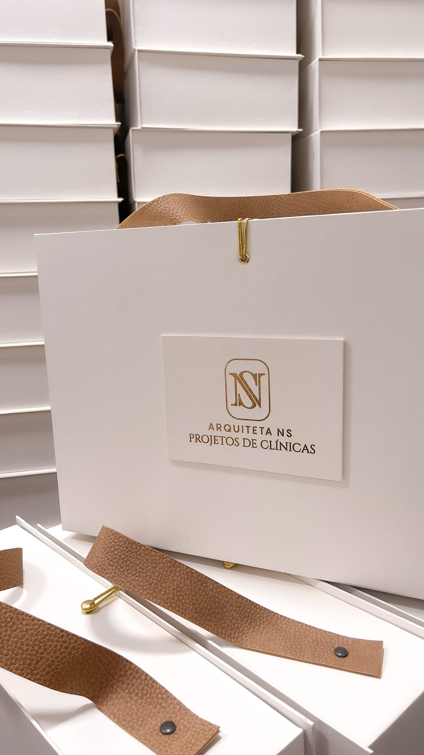 Personalizada com logo em impressão metalizada – Escolha o tom de sua preferência e envie o seu arquivo.