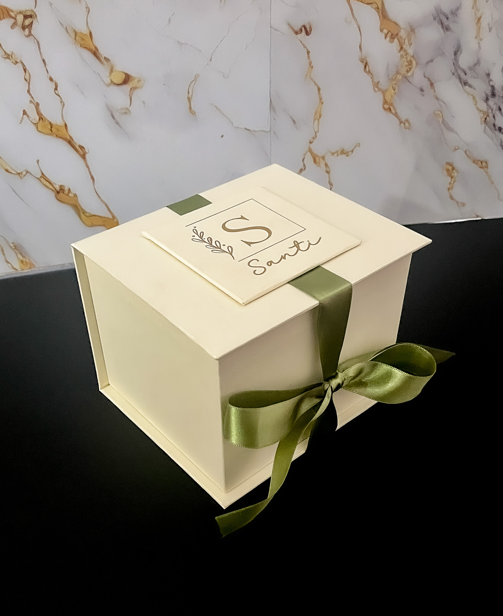 Fechamento com laço de cetim 22mm – envolvendo toda a caixa. Escolha a cor;