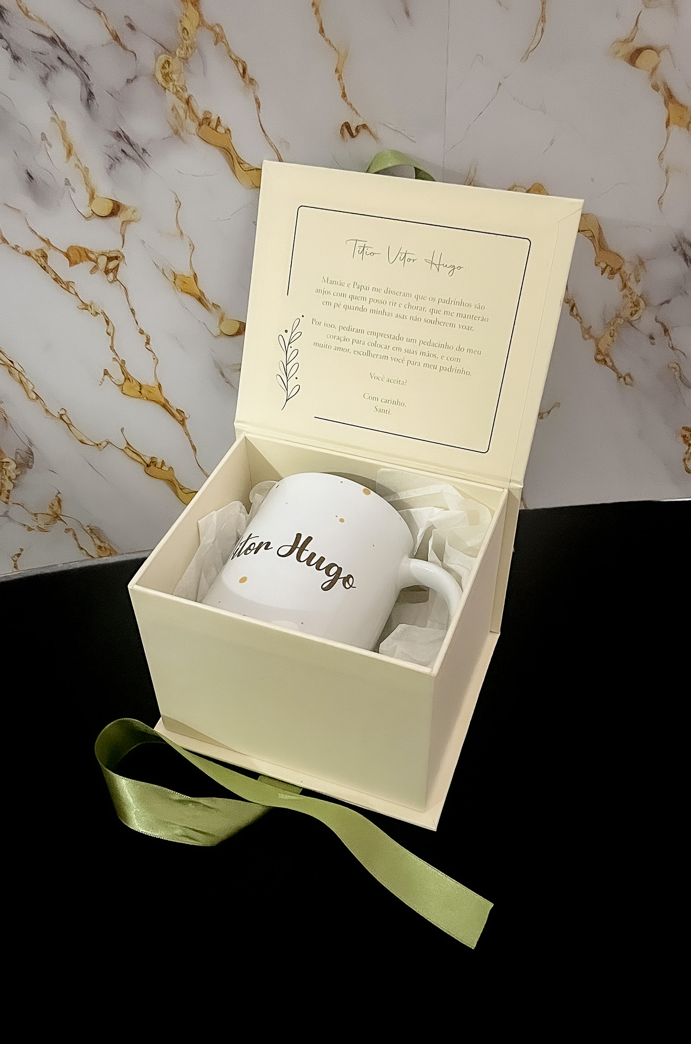 Inclui uma caneca personalizada com nome do Dindo ou da dinda; Informe o nome.